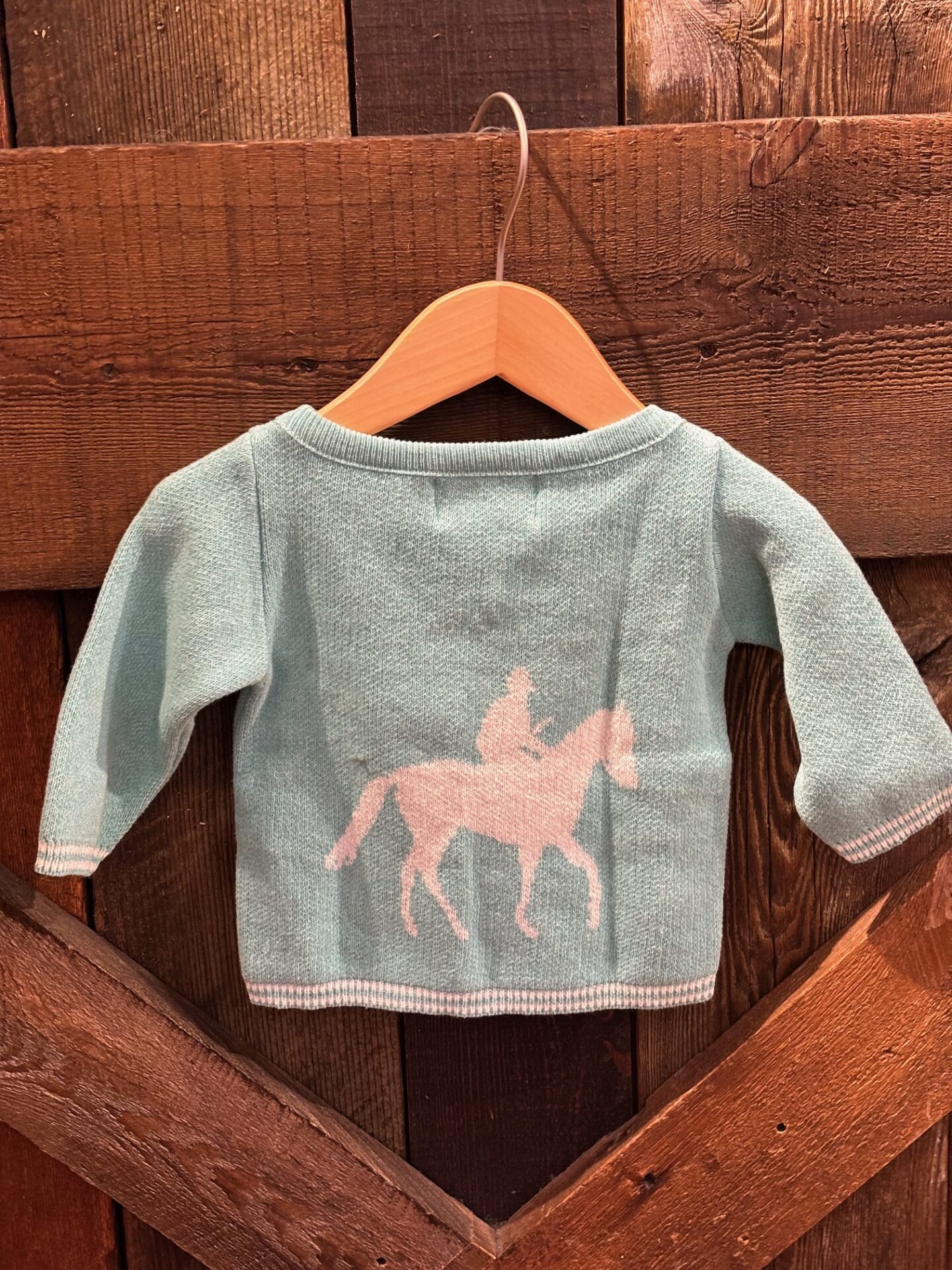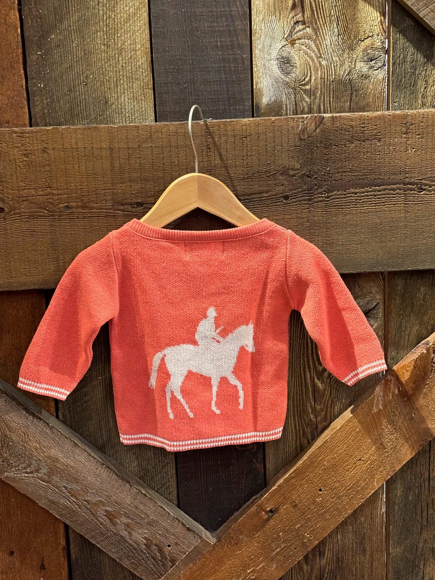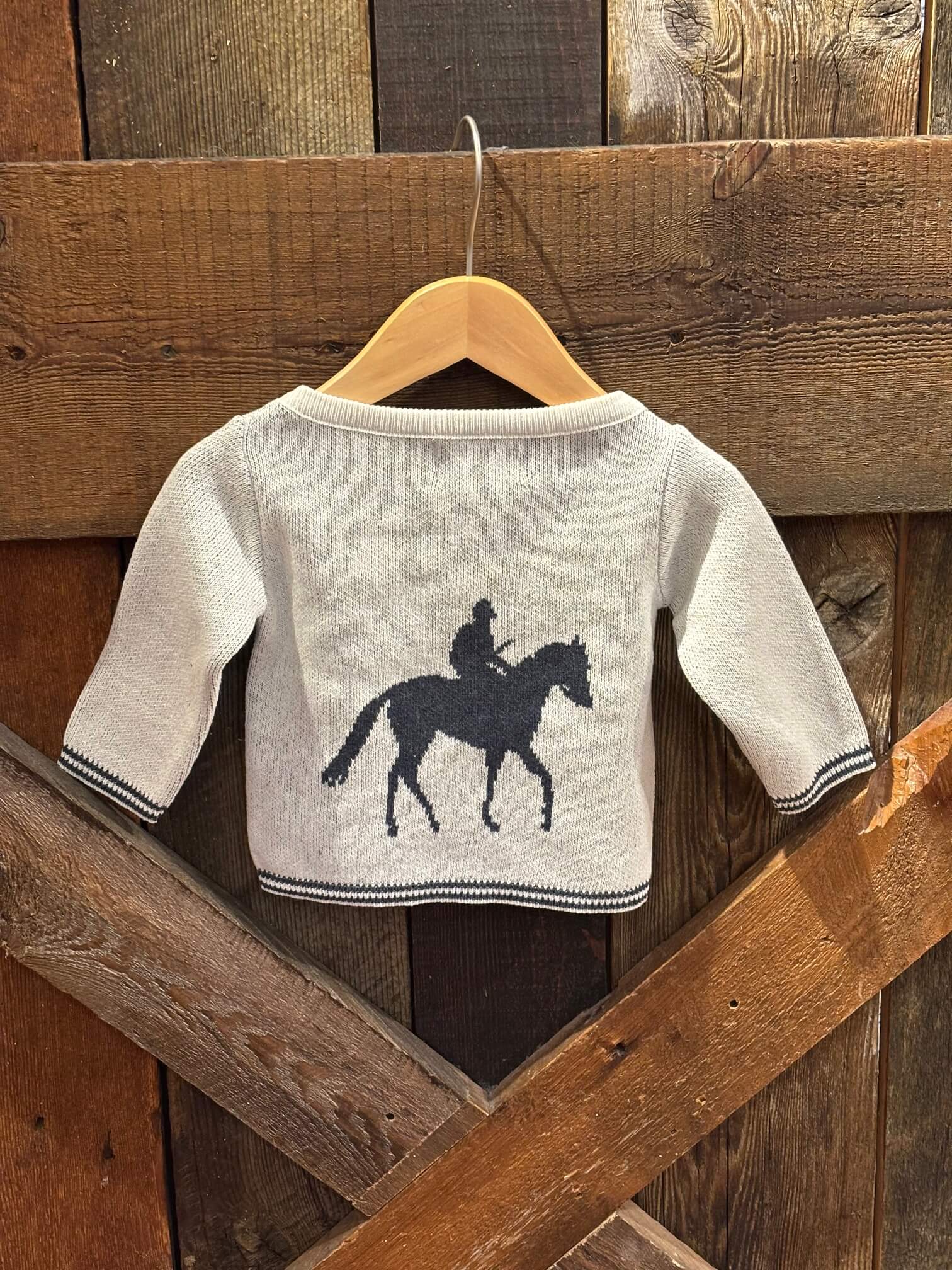 These adorable sweaters pair perfectly with our Knit Baby Mini Stripped Pants. On the back of the sweater there is a silhouette of a horse. Perfect for your little horse lover.