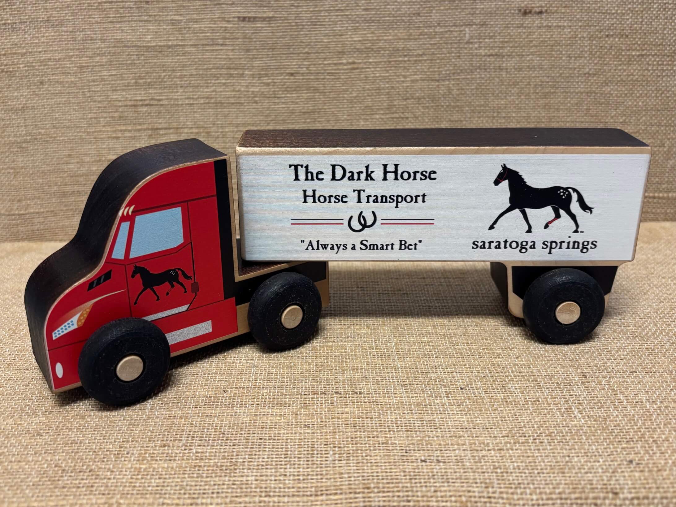 Our Dark Horse Semi Truck trailer can detach from the truck cab. Colorfully printed on locally sourced, sustainably harvested pine with hardwood wheels, the Semi measures approximately 8″ long by 2-3/4″ high. Image is on both sides. Well suited to younger children’s small hands.