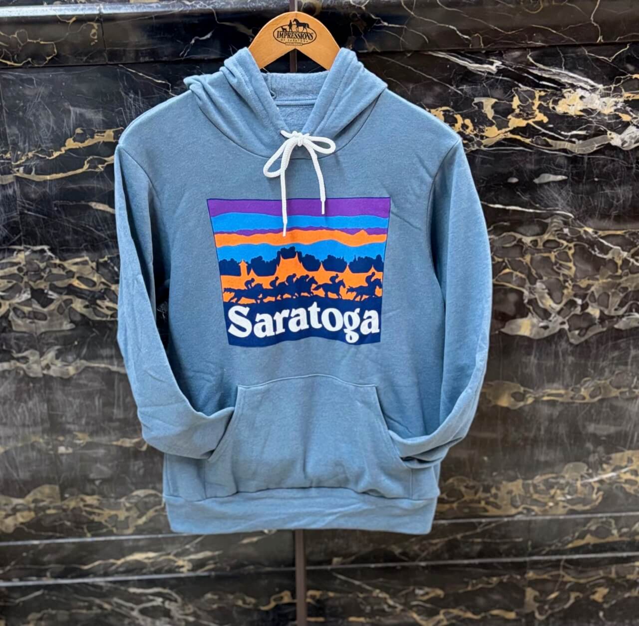 Love the outdoors and Saratoga? This hoodie is the perfect combination. The skyscape hoodie is a super soft “sponge” fleece, it is so comfy you will never want to take it off. Inspired by horses running at dusk with the grandstand in the background the skyscape hood is great for Saratoga Race Course lovers.